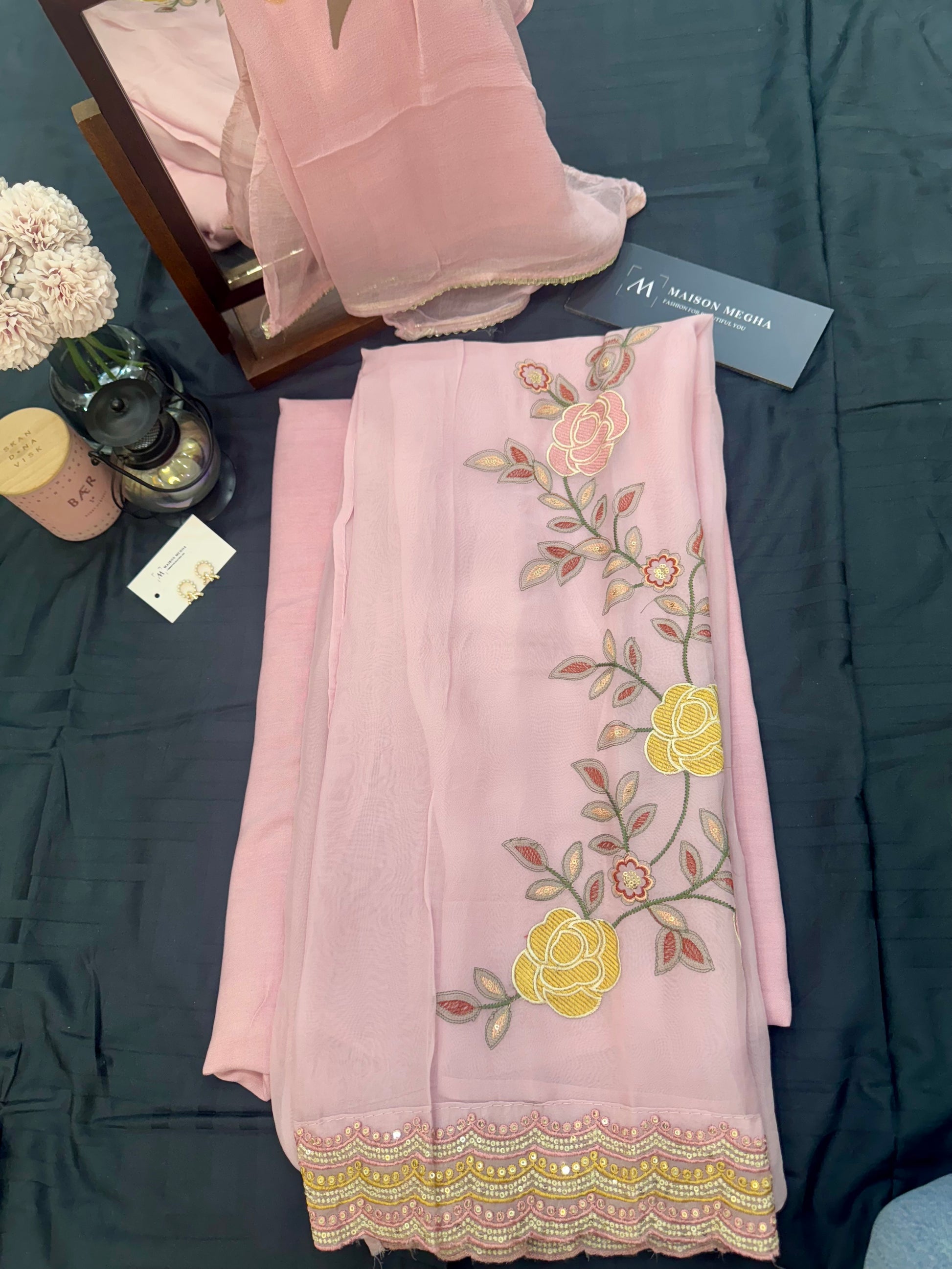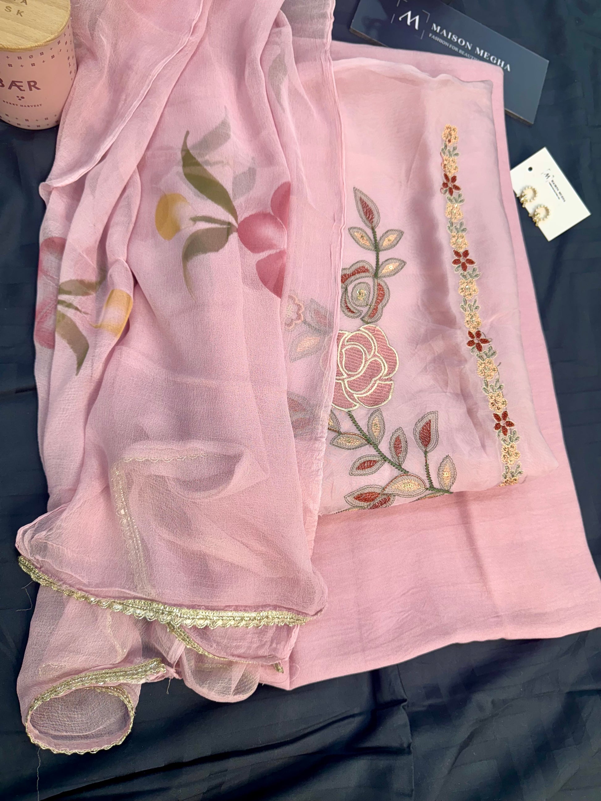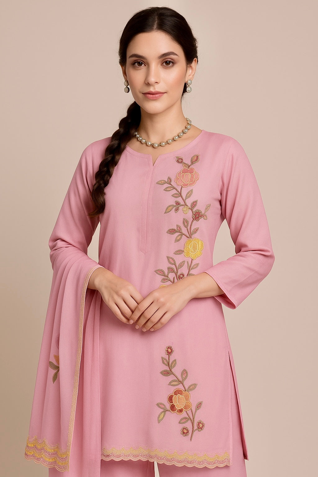 Elevate your ethnic wardrobe with this elegant blush pink suit set, adorned with delicate embroidery and intricate detailing. Crafted in a soft, breathable fabric, this ensemble blends traditional charm with contemporary grace.