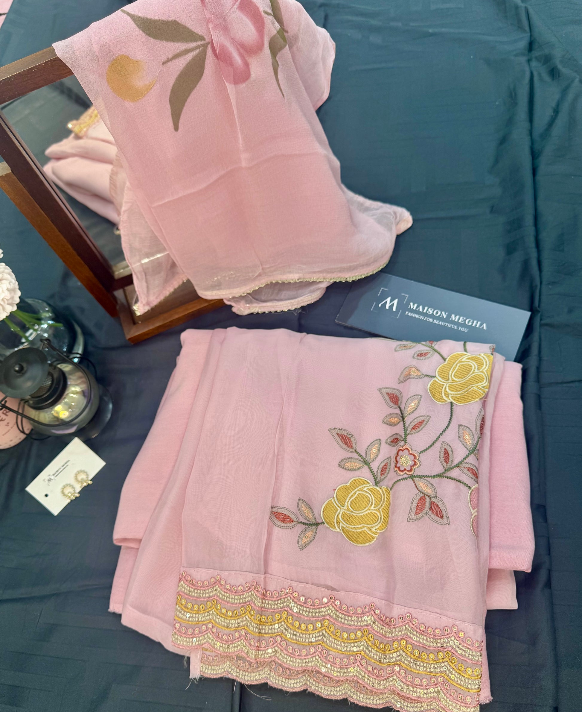 - The dupatta is adorned with subtle hand-painted-style floral accents and a fine border, enhancing its feminine appeal.
