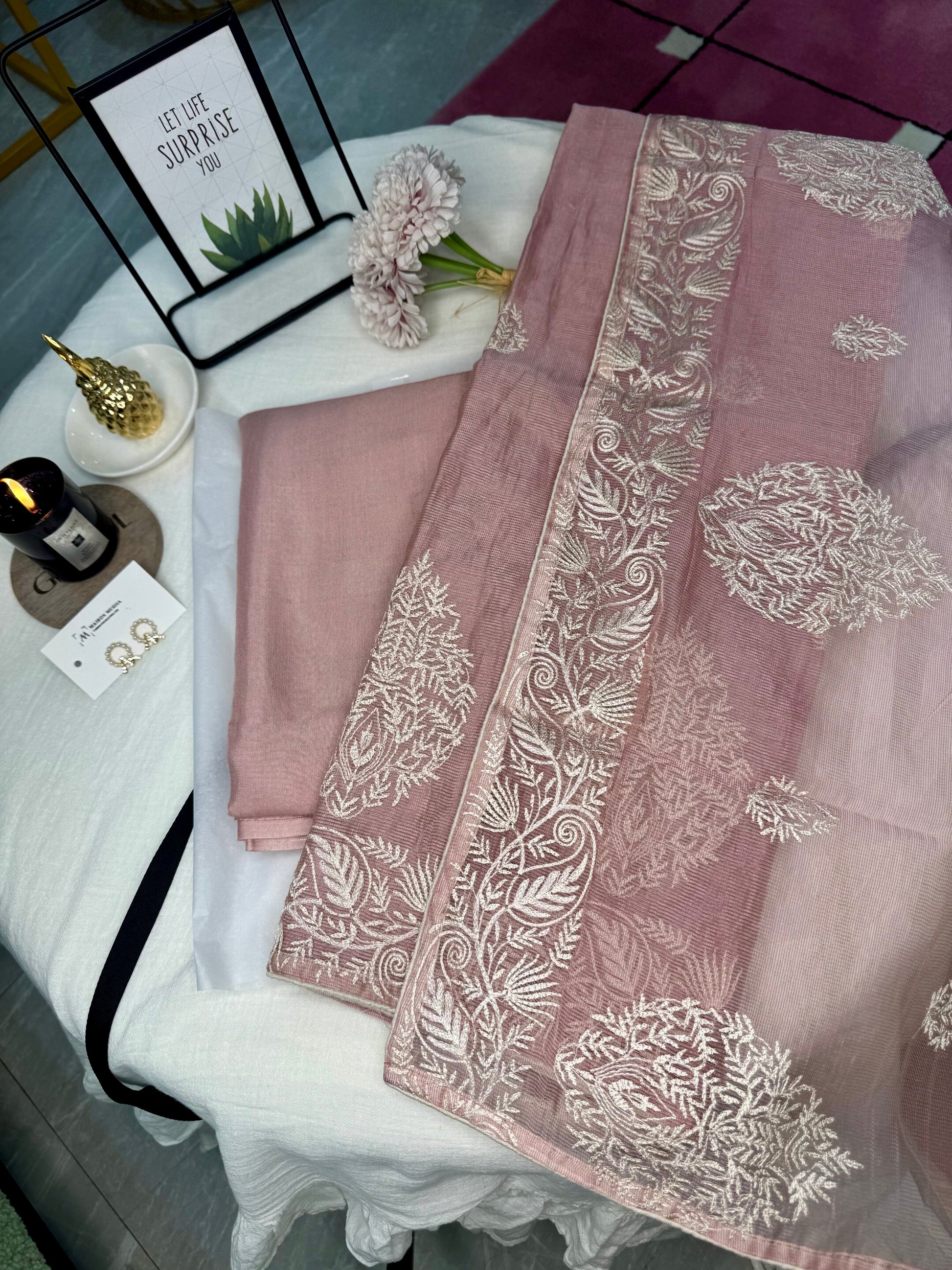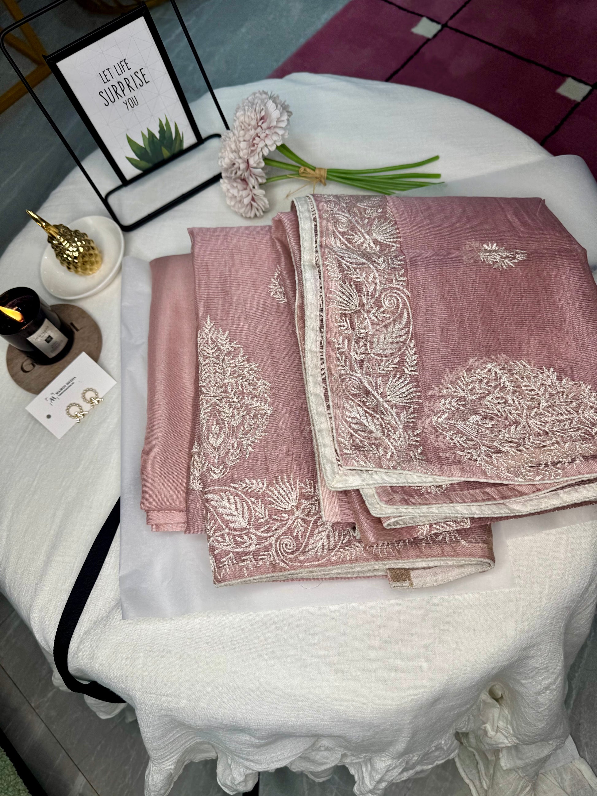 Elevate your ethnic wardrobe with this dusty rose pink unstitched suit set, adorned with intricate white thread embroidery that exudes timeless grace. Crafted on a soft, breathable fabric, the ensemble features delicate motifs and detailed floral patterns that bring a touch of sophistication to every occasion.