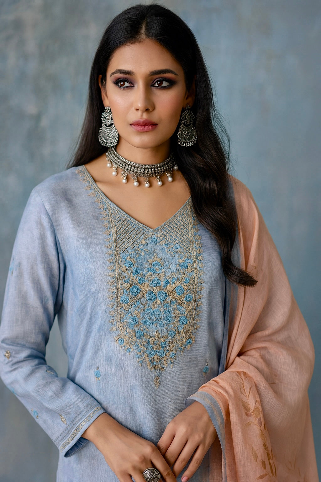 Step into timeless elegance with this exquisite cotton suit set, crafted for the woman who appreciates understated luxury. The soothing blue kurta features intricate hand embroidery in floral and lattice patterns, highlighted with delicate threadwork and subtle embellishments. Paired with a beautifully shaded dupatta in soft hues of peach and lavender, adorned with graceful floral prints and a refined border, this ensemble is a perfect balance of tradition and modern charm.