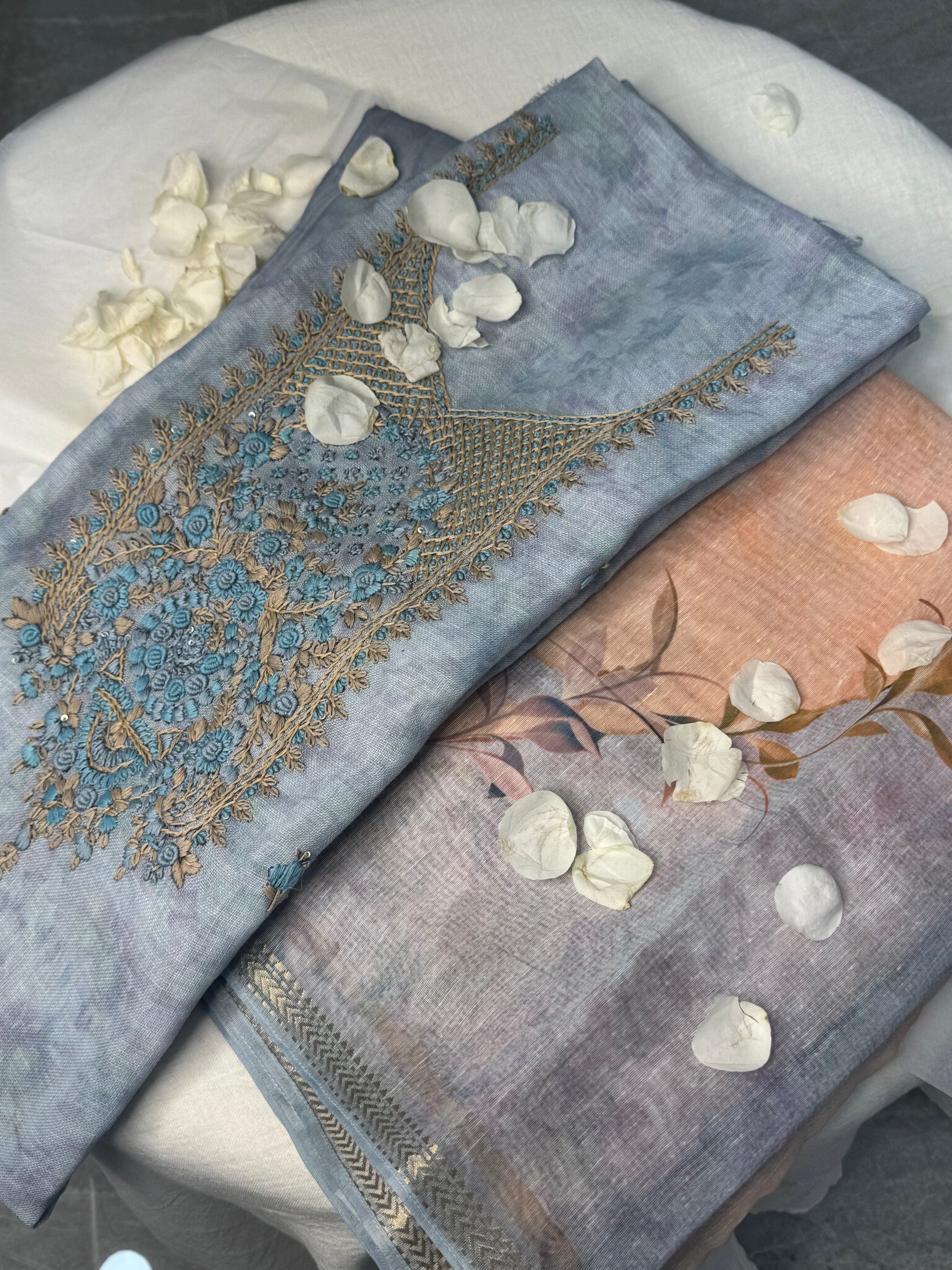 Elegant Blue & Peach Hand-Embroidered Cotton Suit Set