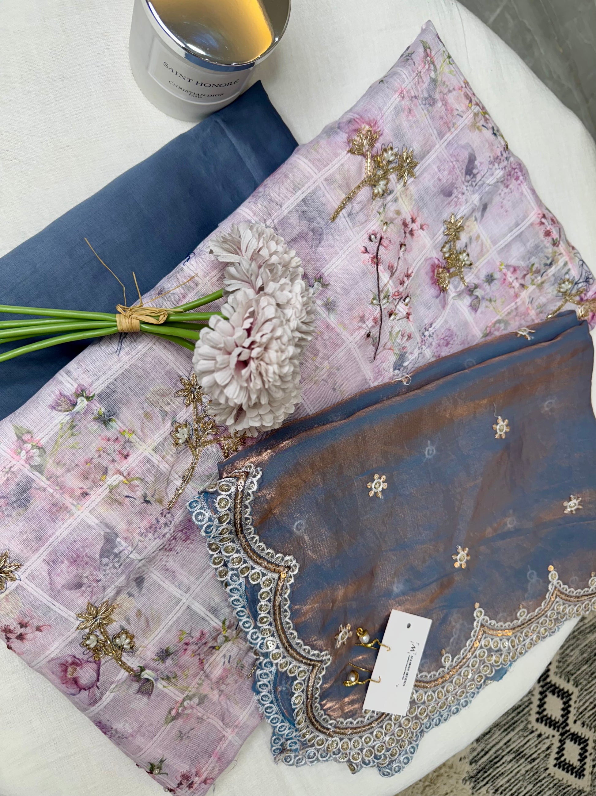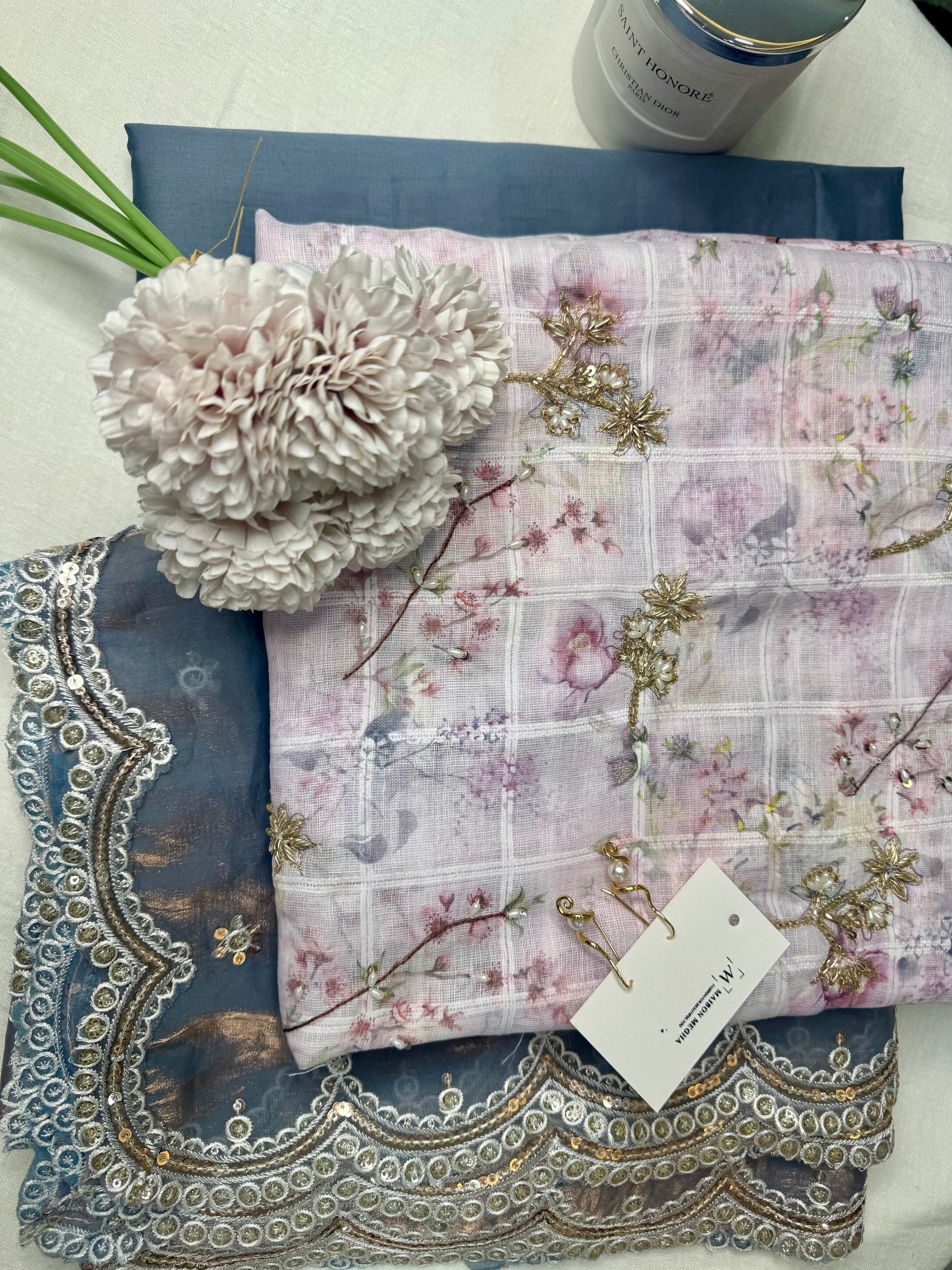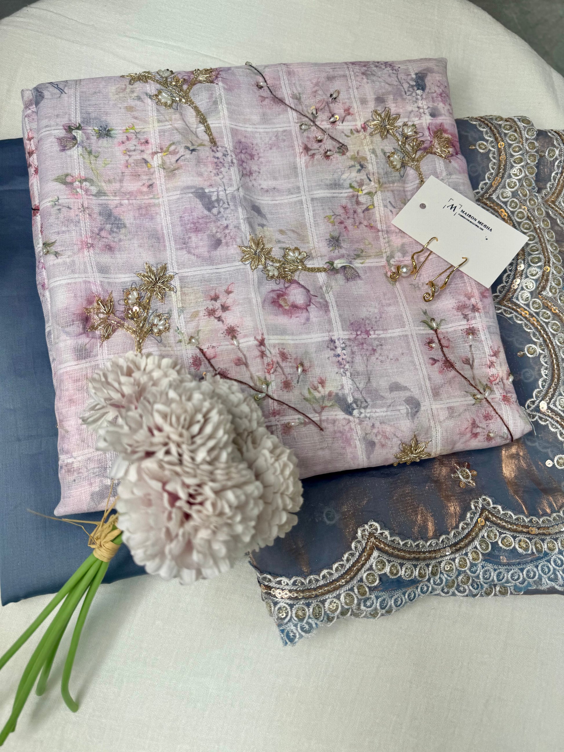 Pastel Blossom & Blue Elegance – 3 Piece Unstitched Suit Set