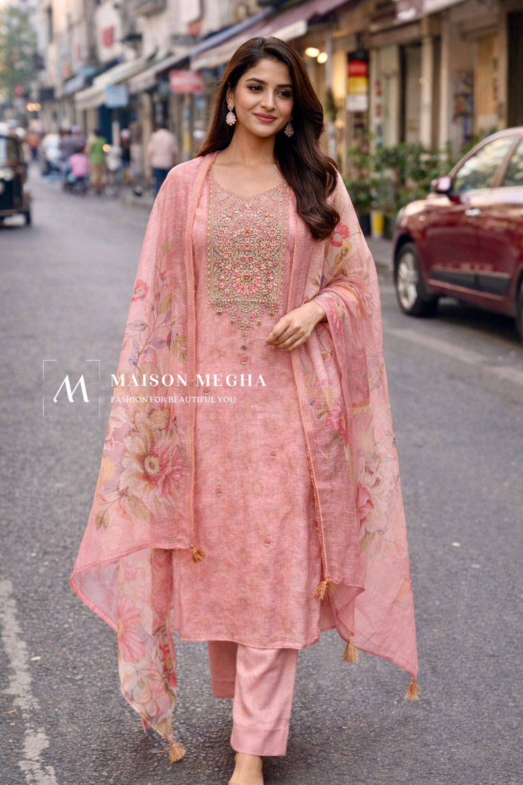 Soft, feminine, and effortlessly graceful — this blush pink cotton suit set is designed to bring a fresh charm to your everyday wardrobe. Crafted in breathable, lightweight cotton, the kurta features an intricately embroidered neckline adorned with delicate floral motifs in subtle pastel tones, adding richness and elegance to the silhouette.