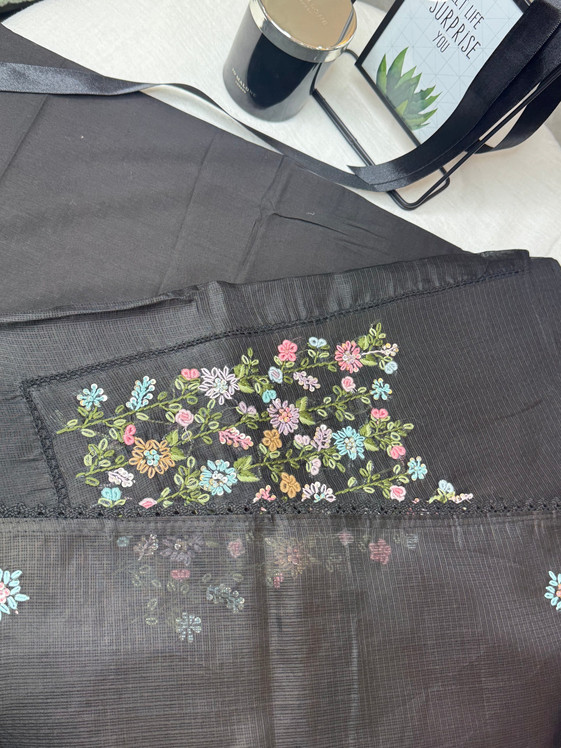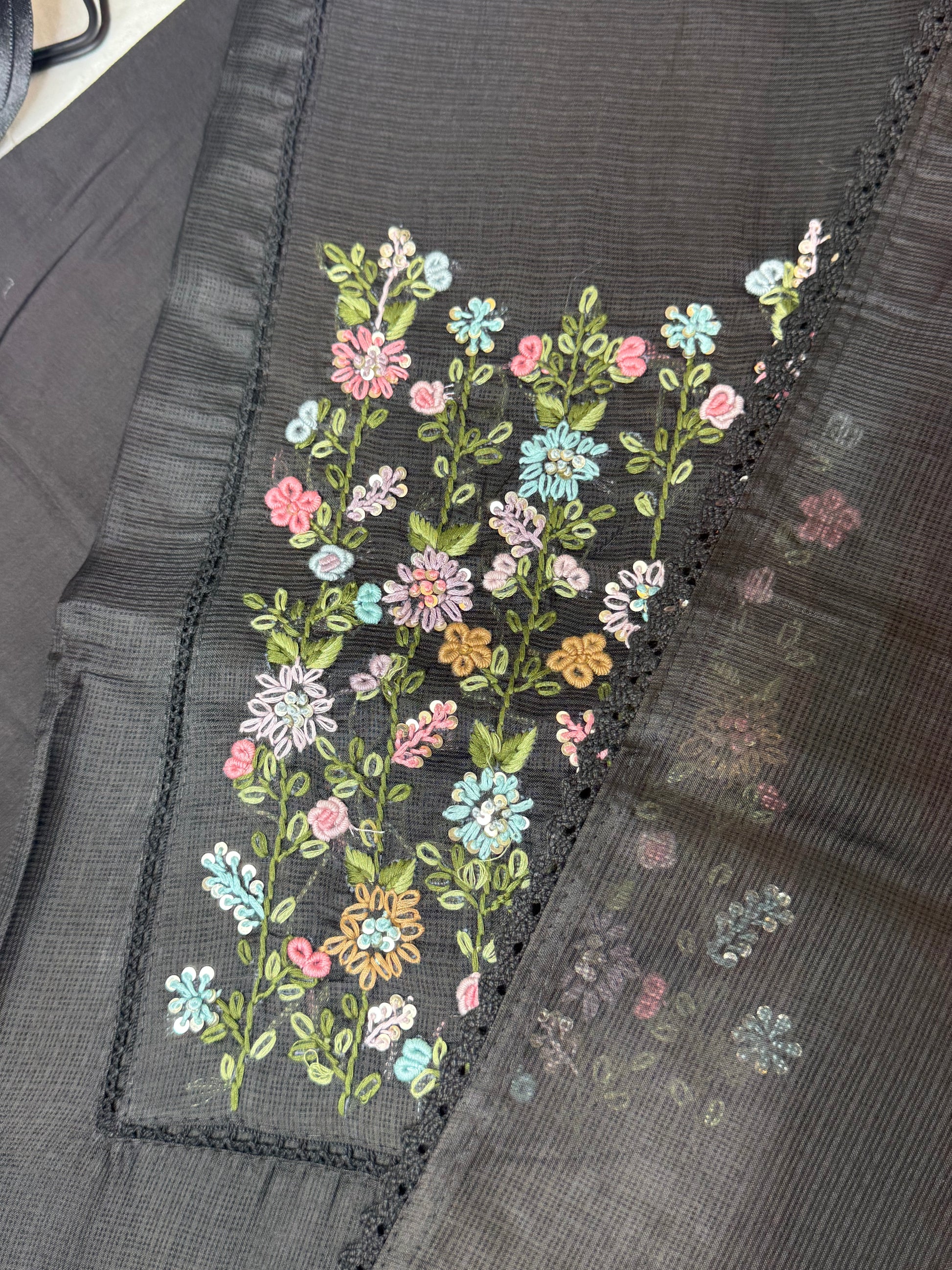 The highlight of this suit is its exquisite hand embroidery—delicate pastel florals intricately crafted on a sheer black base. Each motif is thoughtfully designed, adding a touch of artistry and charm to the ensemble. The subtle shimmer of the threadwork enhances the sophistication of the piece without overpowering its simplicity.