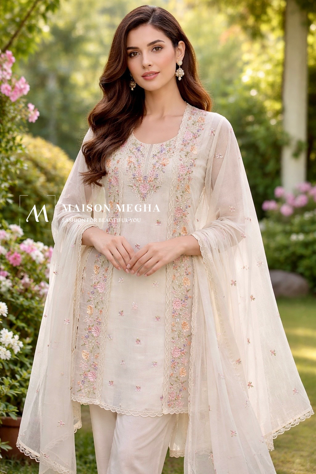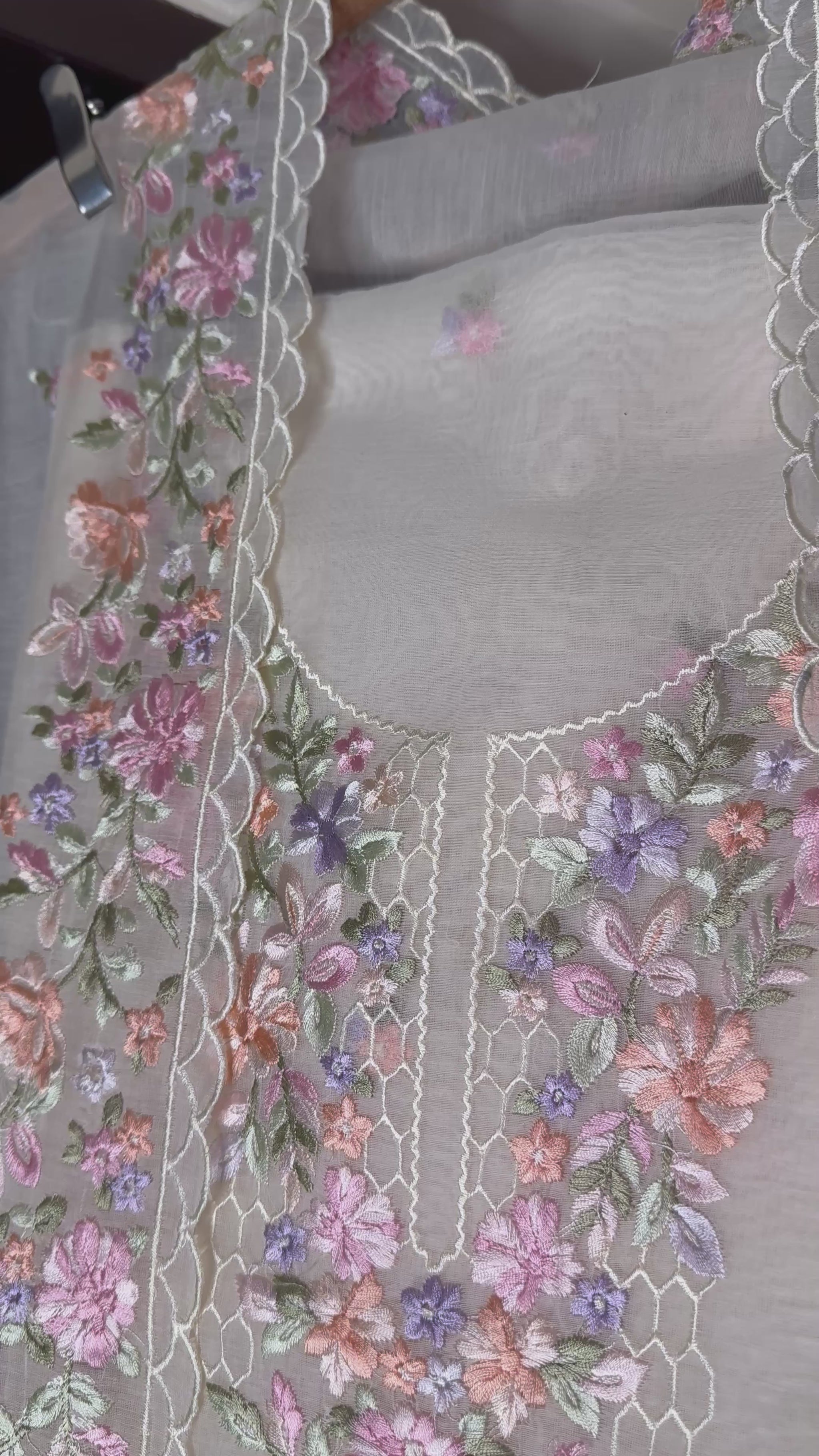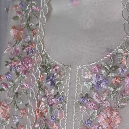 Delicate, dreamy, and effortlessly elegant—this pastel embroidered suit set is a timeless addition to your ethnic wardrobe. Crafted in a soft, sheer fabric, the kurta features intricate multicolour floral embroidery scattered all over, with beautifully detailed panels highlighting the neckline and front. The fine threadwork is complemented by scalloped lace edging, adding a graceful finish.