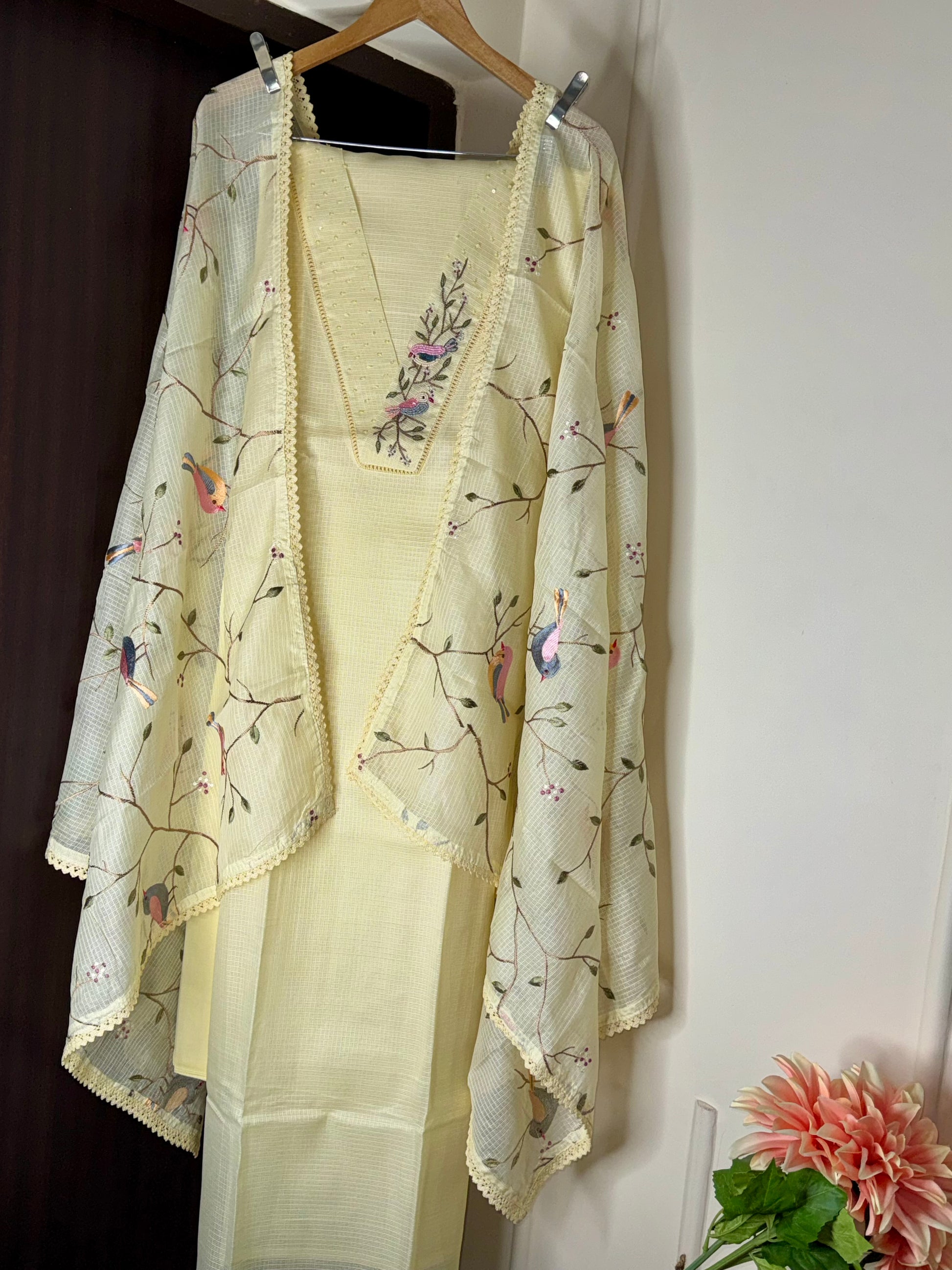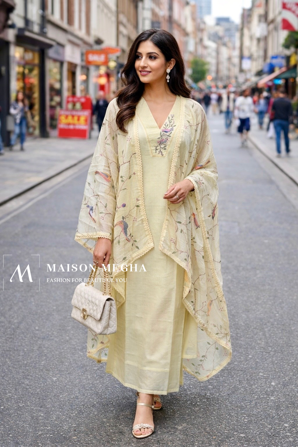 Fresh, airy, and effortlessly elegant, this lemon yellow Kota suit set is crafted for those who love subtle detailing and timeless craftsmanship. The kurta is made from lightweight Kota fabric, featuring a delicately embroidered neckline with fine thread and minimal embellishment for a graceful finish.