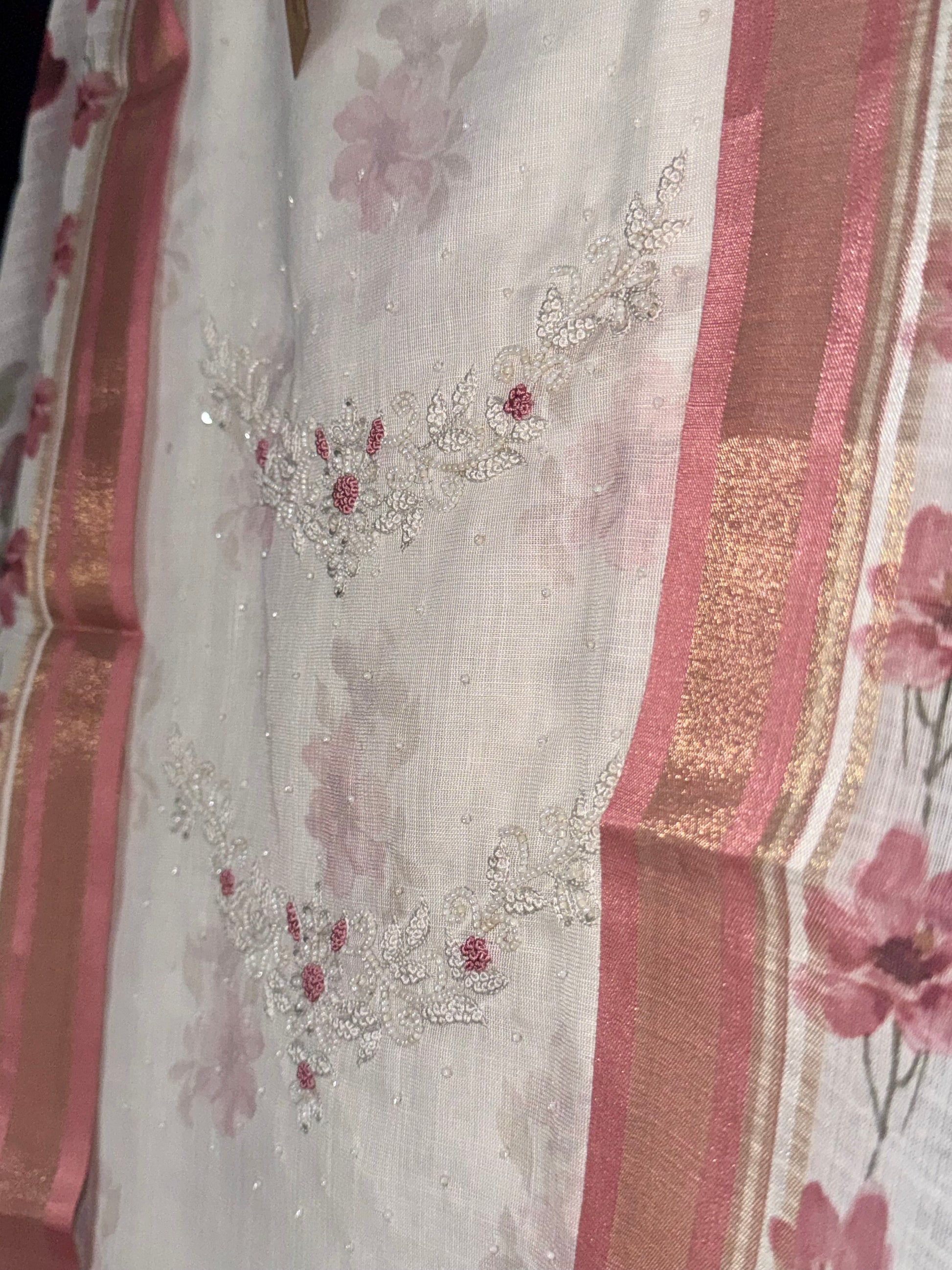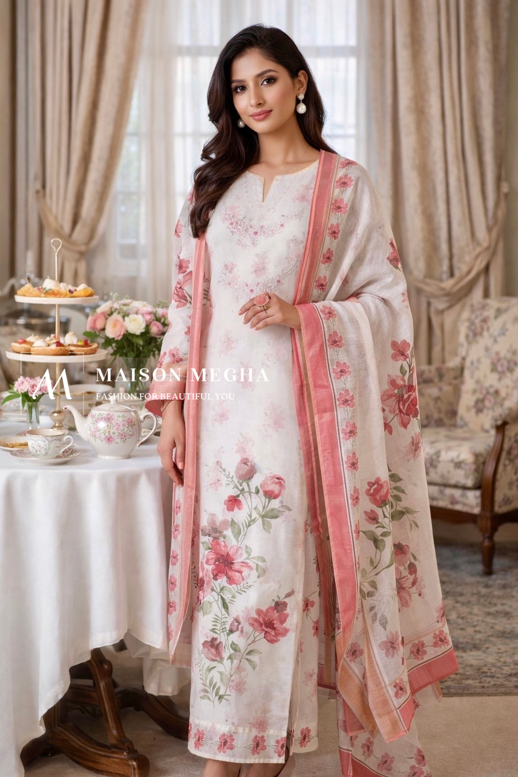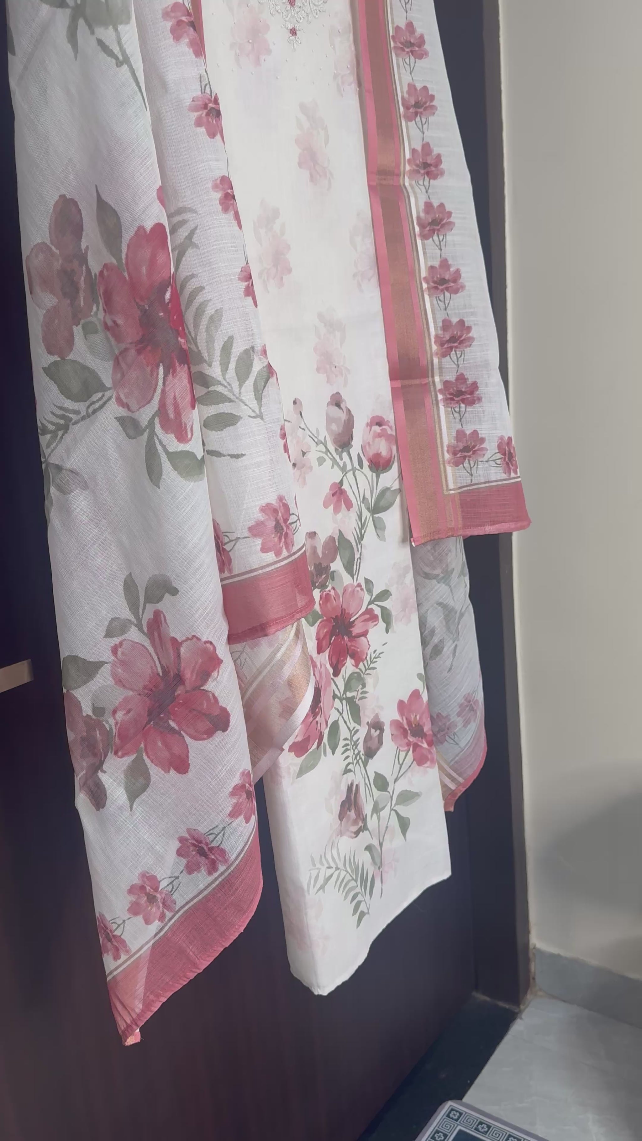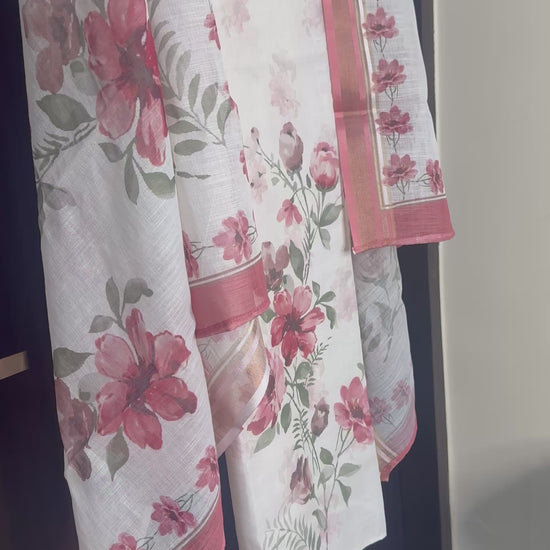 Soft, graceful, and effortlessly elegant — this cotton suit set is a celebration of delicate florals and timeless charm. Crafted in breathable premium cotton, the ensemble features a soothing off-white base adorned with romantic pink floral prints that exude freshness and femininity.